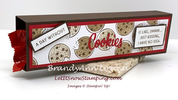 For this project, I folded a piece of Early Espresso cardstock around a small package of Nutter Butters, burnished the folds with my bone folder, then layered and embellished the front.
