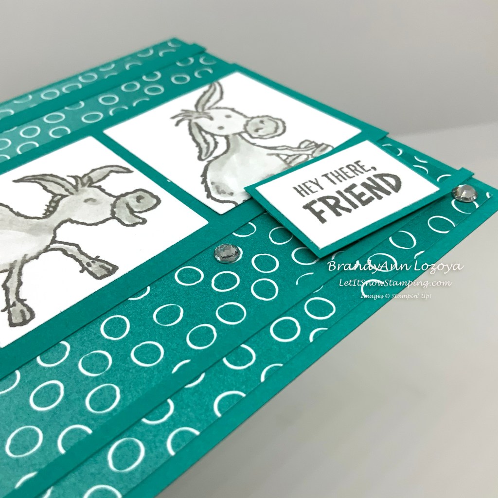 Each image is stamped in Basic Gray. I used a blender pen to color in the donkeys using Smokey Slate. Some foam tape helps to pop up the sentiment while the Rhinestone Basic Jewels add a little sparkle.