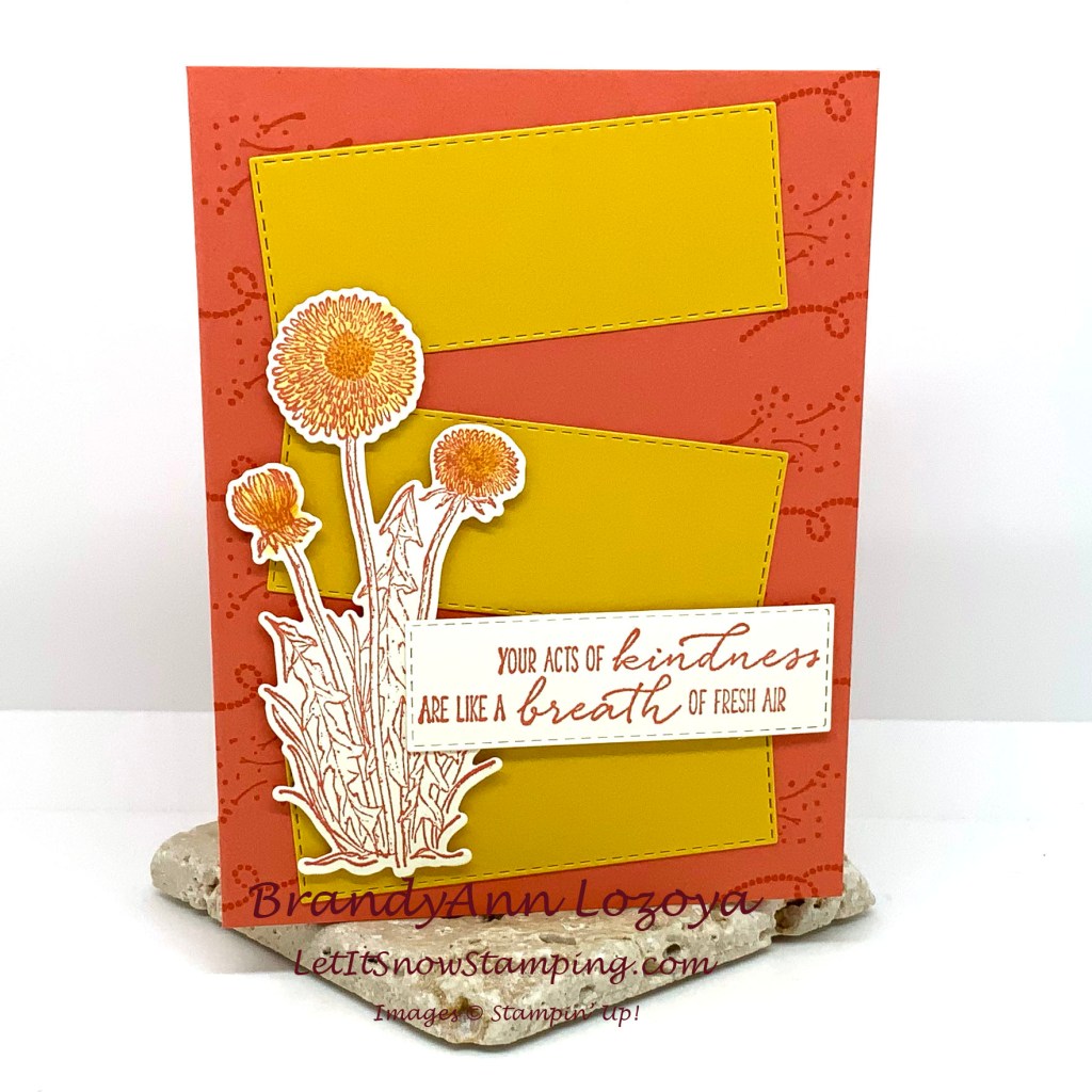 Next I stamped the dandelions in Calypso Coral onto Very Vanilla cardstock and cut them out with the matching Dandy Wishes dies and another stitched rectangle die for the sentiment. I attached them to the card front using Stampin’ Dimensionals to make them pop off the card.