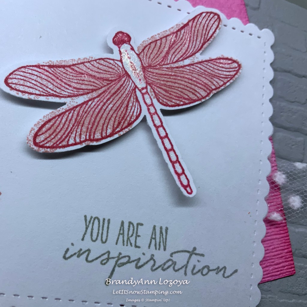 You will notice that it looks like it is only for the right side of the dragonfly. However, when you punch out the dragonfly using the Dragonflies Punch you cannot really tell if you turn it upside down and use it on the left side. It just looks artsy 🙂 There is also a technique called Stamp Kissing, which is another topic for another day, but you can do a search on YouTube and find some excellent tutorials.