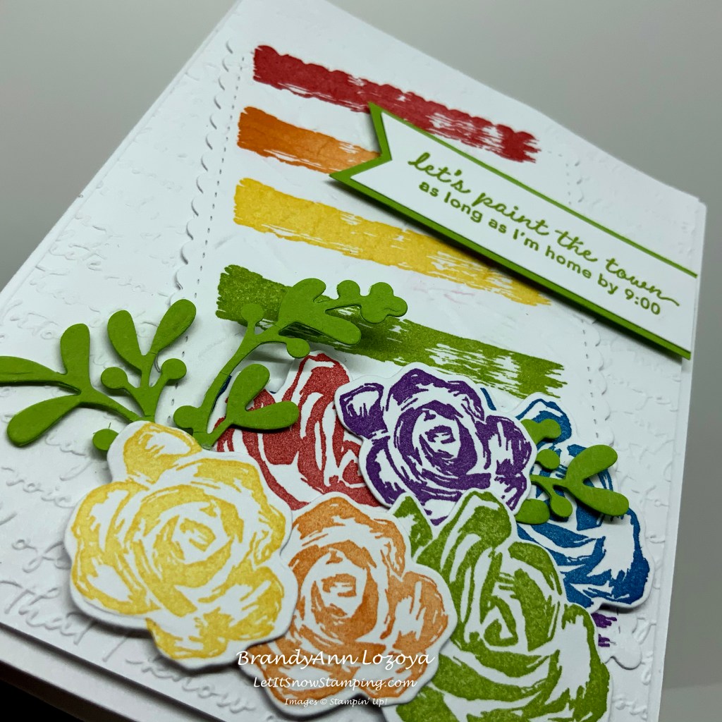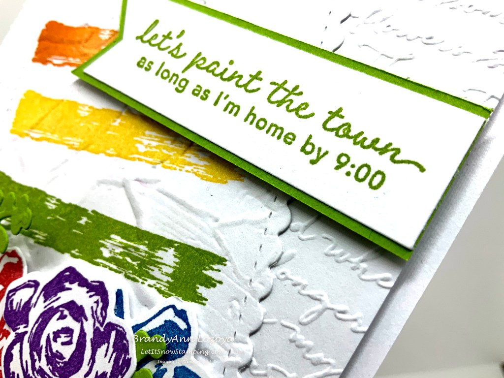 Next, I stamped my rainbow colors onto a scrap of Basic White and cut it out using the largest rectangle of the Stitched So Sweetly Die set. I thought it looked a little bland, so I then ran it through the embossing machine using the Painted Texture 3D Embossing Folder to add a bit of texture to make it pop a bit more.
