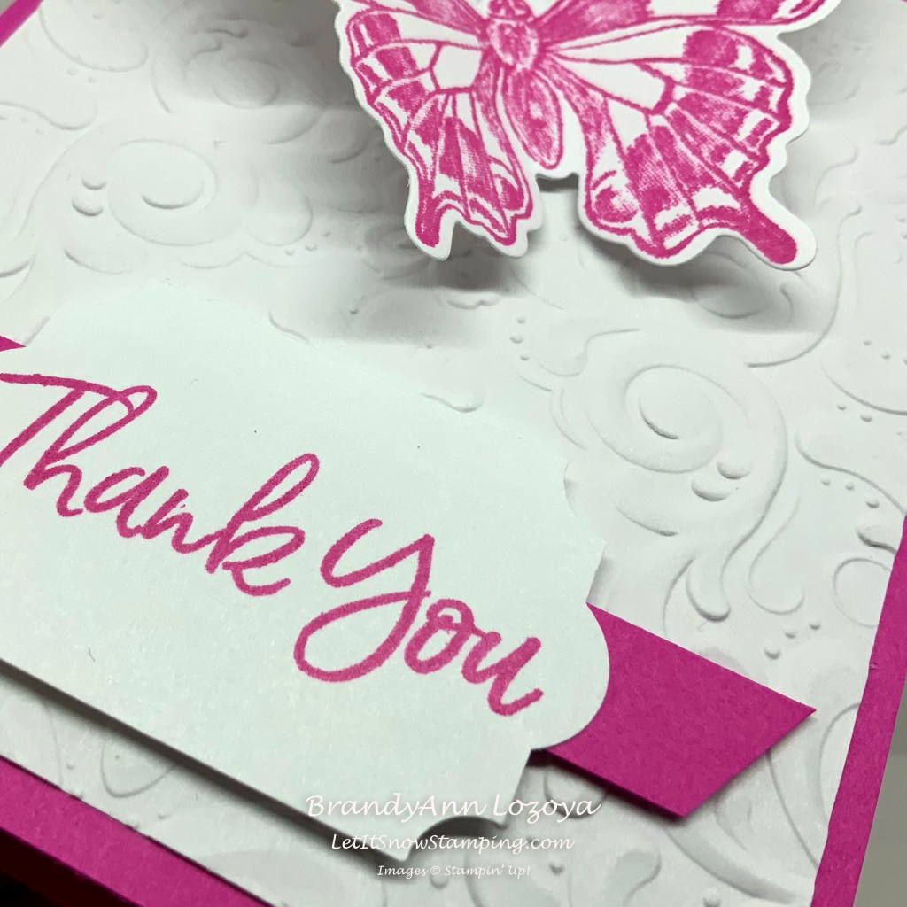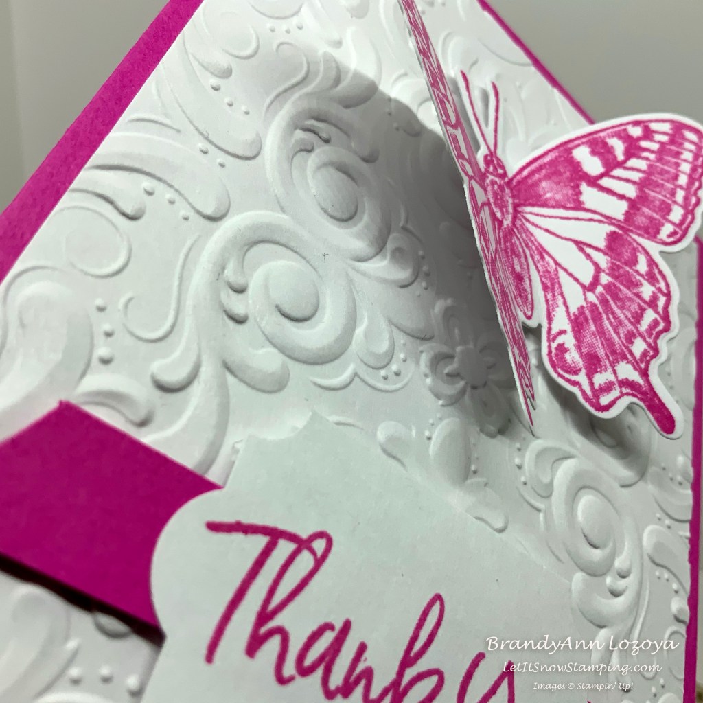 Next, I added one dimensional, that was cut in half, to the body of the butterfly and centered it on the upper part of the card. Then, I bent the wings at the body’s edge to angle the wings