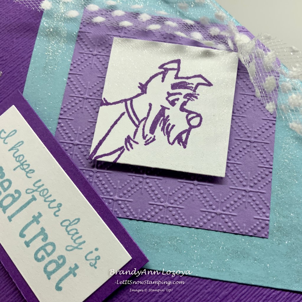 Instead of using the embossed Balmy Blue square, I decided to use plain cardstock and added Wink of Stella to make it glittery. I also added Wink of Stella on the white square around the pup.