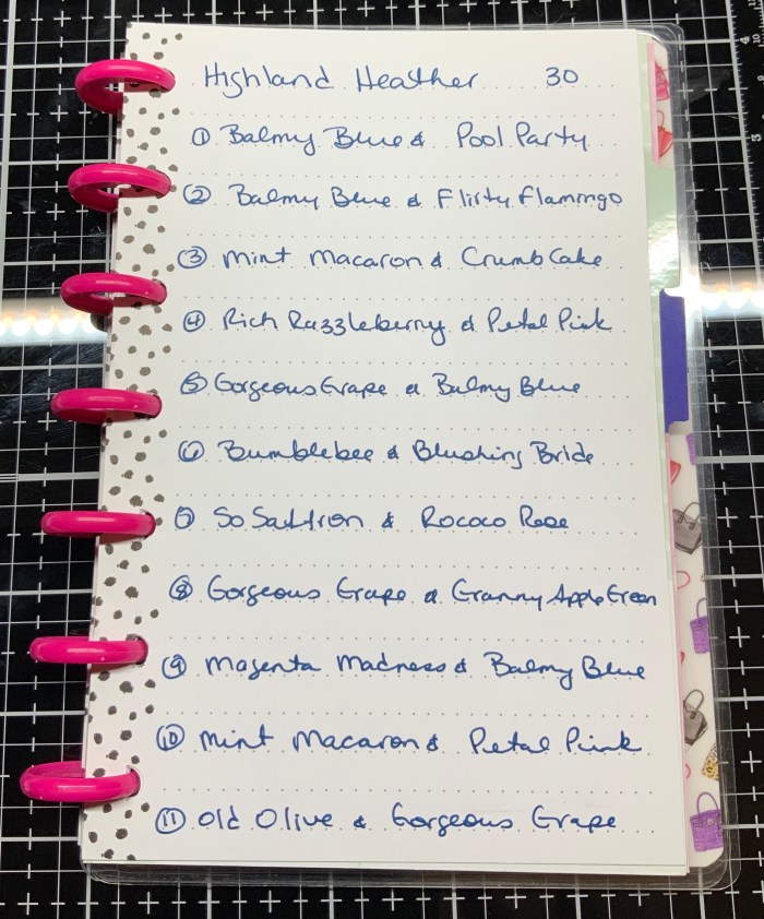 I grabbed my book to help me choose something that went with Highland Heather, because I haven’t used that color much. I decided to go with combo #5 on my list. Highland Heather, Gorgeous Grape, and Balmy Blue.