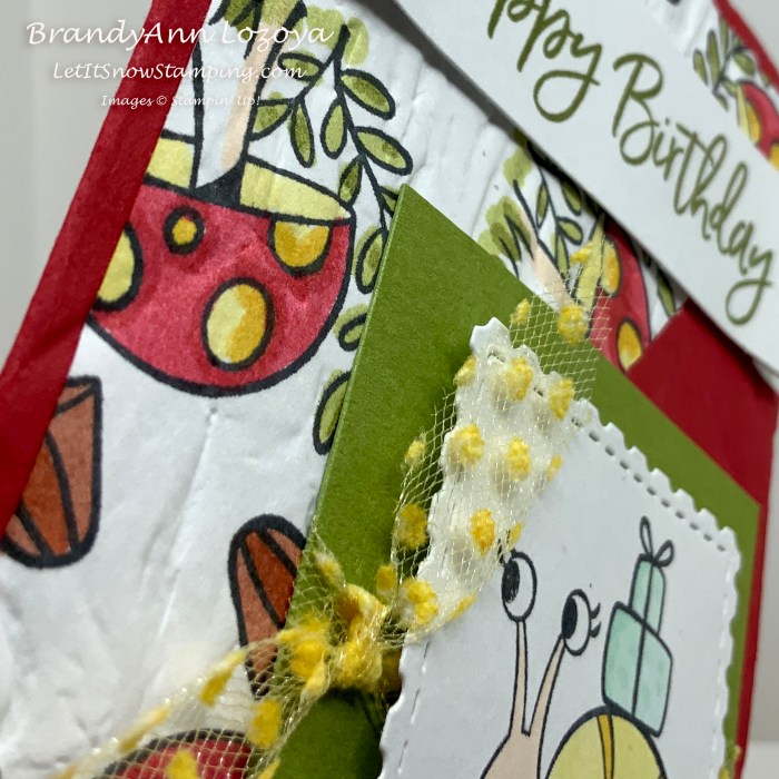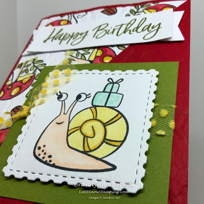 Then, I stamped my snail image on a scrap of Basic White cardstock and cut it out using the postage stamp die from the coordinating die set. After coloring it in with Stampin’ Blends, I mounted it using Stampin’ Dimensionals.