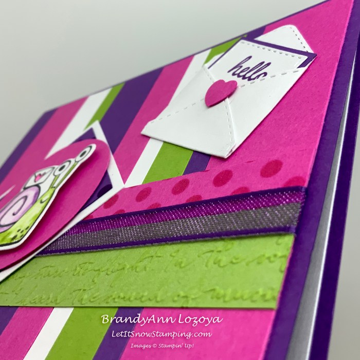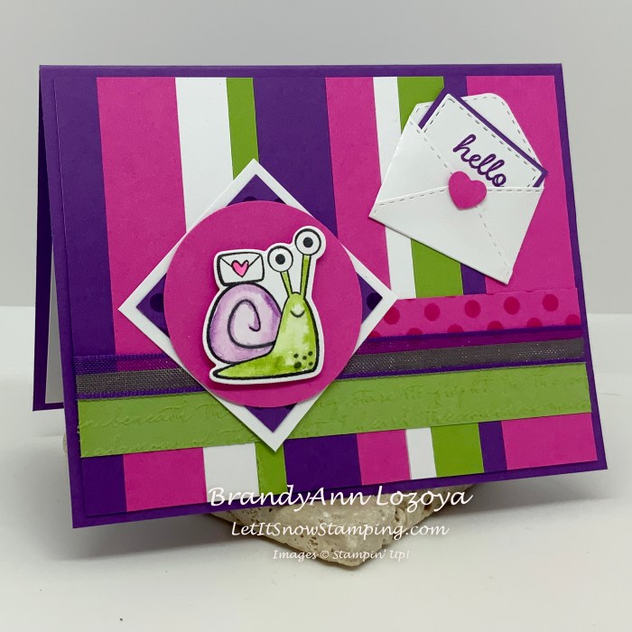 Using another scrap of Basic White and the Snail Dies set, cut out an envelope and letter. Stamp the sentiment in Gorgeous Grape and mat on a scrap of Gorgeous Grape. Trim mat to desired size using a ruler and craft knife or a paper trimmer. Just make sure it fits in the envelope. Tuck the sentiment into the envelope and glue it in. Using the Dog Builder Punch, cut out the heart shape in Magenta Madness and glue to the envelope using a Glue Dot.