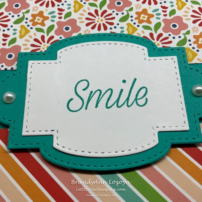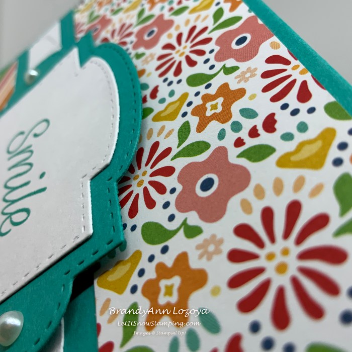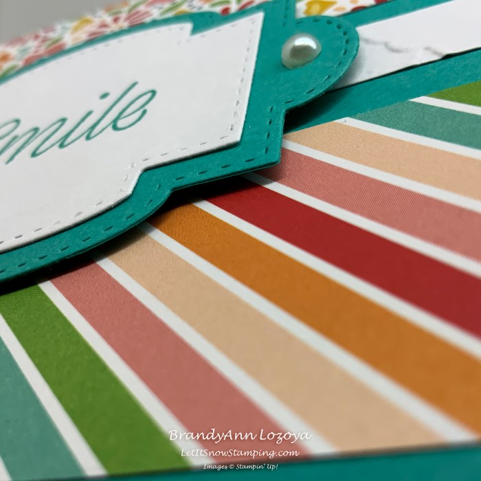 I love how the Bermuda Bay card base brings out all of the colors in both papers. The card base measures 8-1/2″x5-1/2″, scored and folded at 4-1/4″.