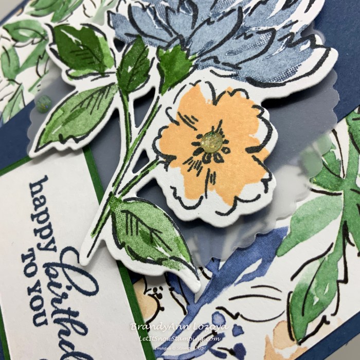 After stamping all of the blossoms and leaves, fill in the remaining parts of the stem using a Water Painter and Garden Green stamp pad.