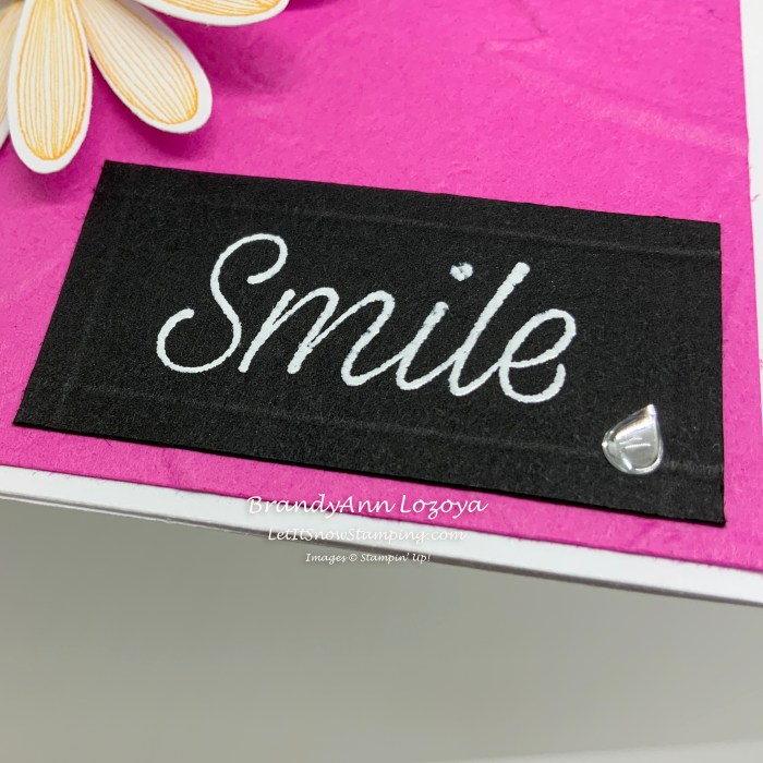 On a 2″x1″ piece of Basic Black Cardstock, stamp the “Smile” senitment using VersaMark. Then, sprinkle with the white embossing powder and heat set with a Heat Tool until the embossing powder is smooth.
