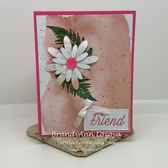 Punch another daisy using the Medium Daisy Punch in white and layer on top of the larger one using a Glue Dot. Add a Stampin’ Dimensional to the back of the larger one and glue down in the center of the leaves.