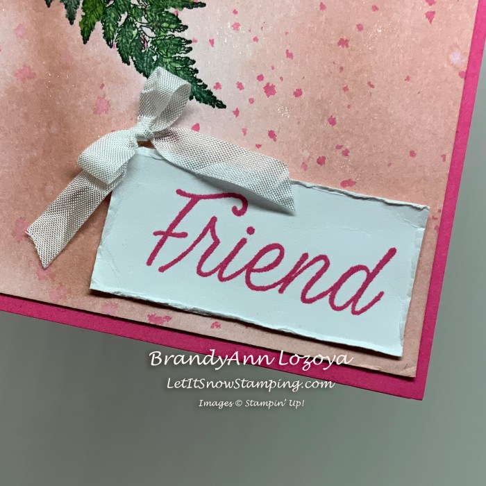 On another scrap piece of white cardstock, measuring 2″x1″, stamp the Friend sentiment in Polished Pink and distress the edges a bit. Adhere to the card on the lower right hand side.