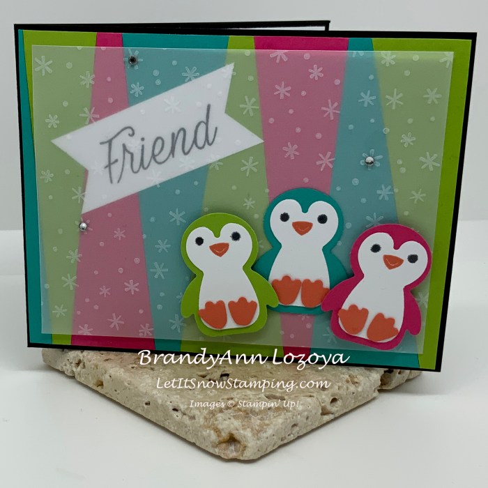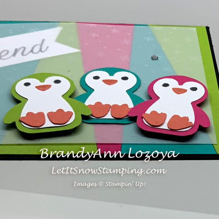 I glued down my blue penguin with regular tape adhesive and used Stampin’ Dimensionals for the green and pink penguins for a bit more dimension.