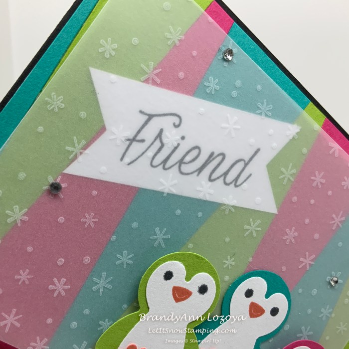 I am so excited to share today’s project with you! It is so bright and cheerful and the little penguins are just adorable! The dark card base intensifies the tropical colors and the stamped vellum softens them to let the penguins shine.