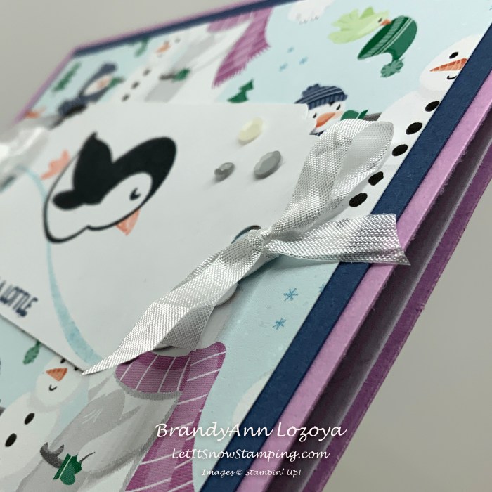 On the Fresh Freesia card base, layer the Misty Moonlight and Penguin Playmates DSP and glue down.