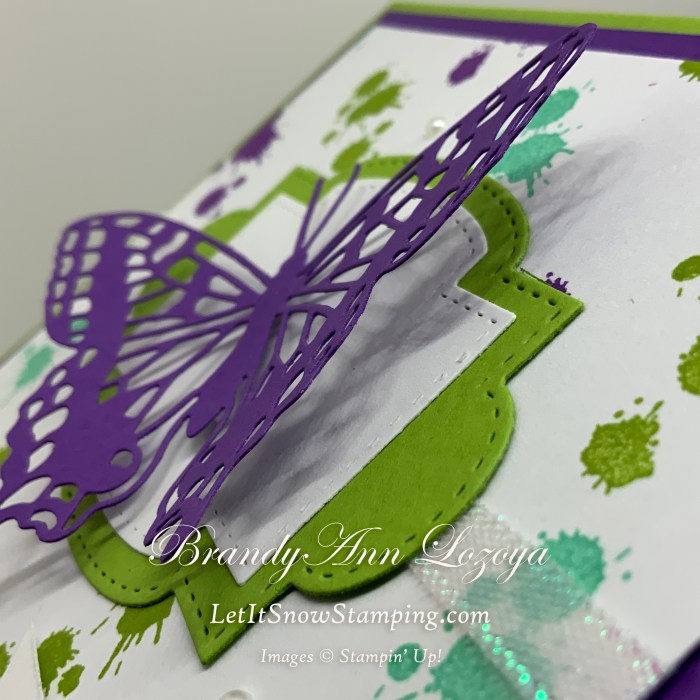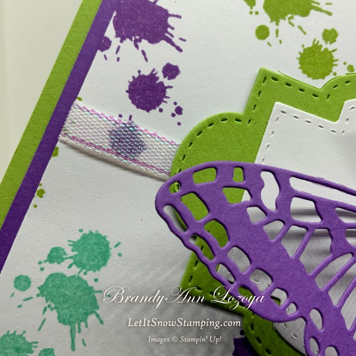 Using the splatter stamp from Textures & Frames, stamp with Gorgeous Grape, Coastal Cabana, and Granny Apple Green in a random order. Make sure to have some of the splatters come off the edge.
