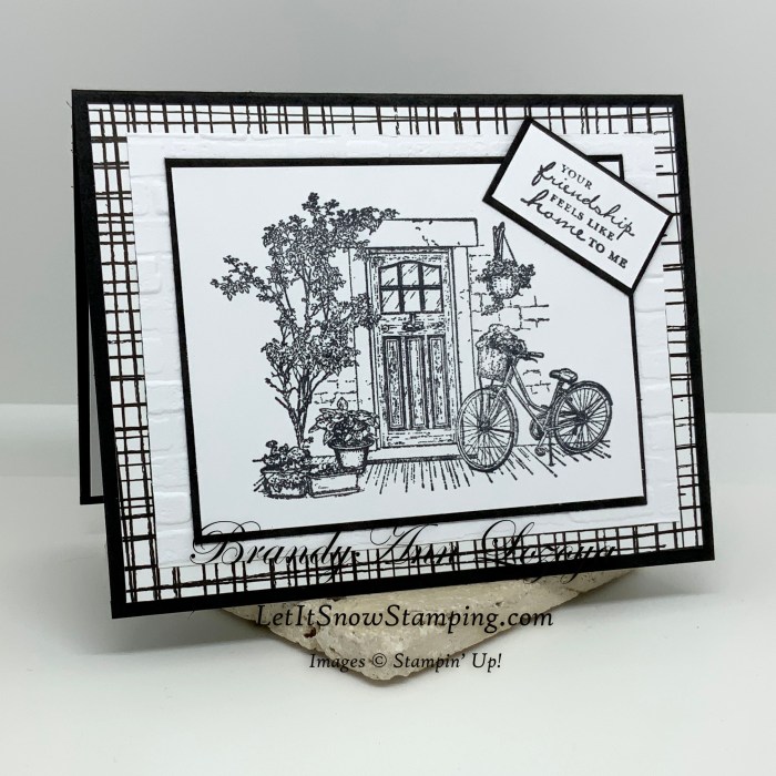 This week’s stamp set is the Sale-A-Bration Feels Like Home set. (It is not available for purchase, but you can earn it as a FREE reward with any $50 purchase until September 30, 2021.) I have seen so many beautiful cards made with this set. Most of them have been expertly colored in with different types of mediums – pencils, markers, chalk, etc. However, today I wanted to create a black and white card and this beautiful porch looked so welcoming.