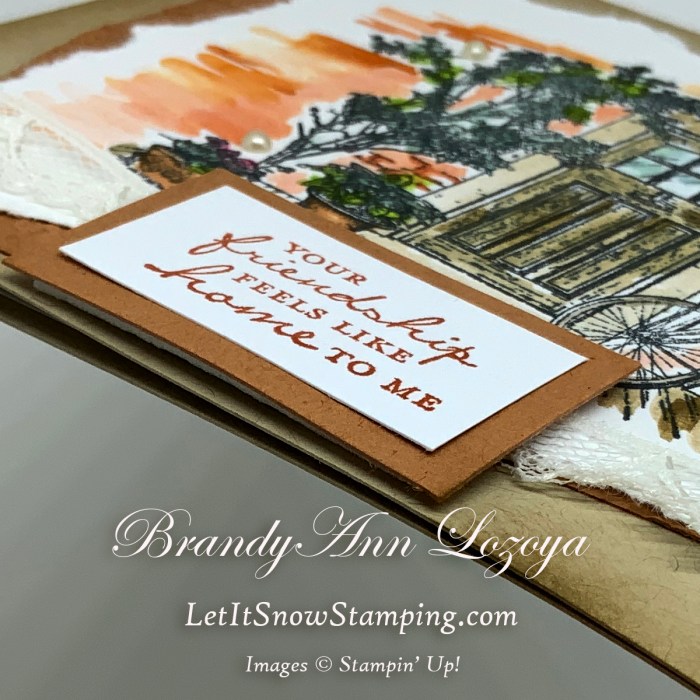 Cut a 4″ piece of Scalloped Lace Trim and set across the bottom of the stamped image.