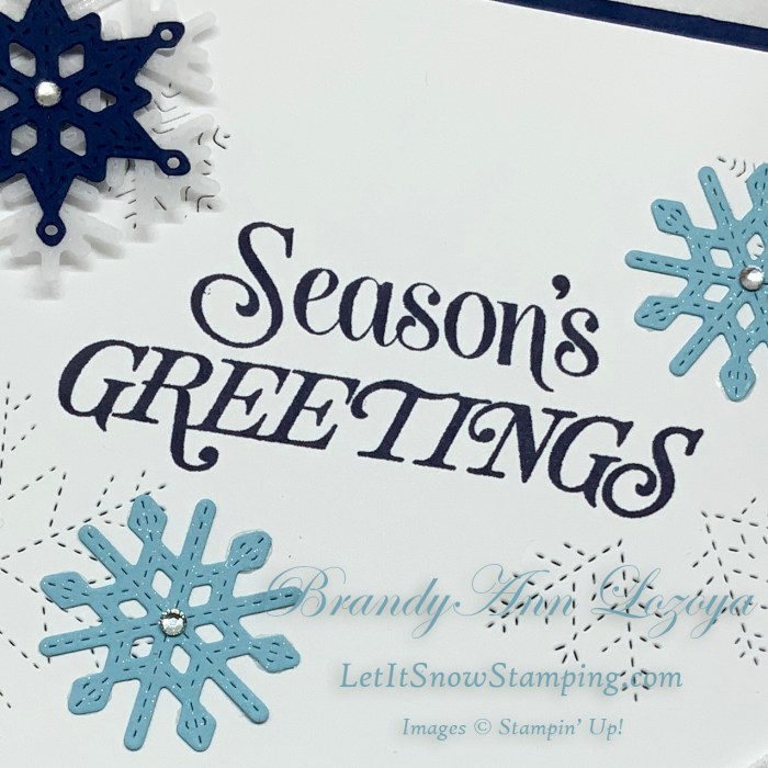 Stamp sentiment on inside panel with Night of Navy ink and the snowflakes in Balmy Blue.
