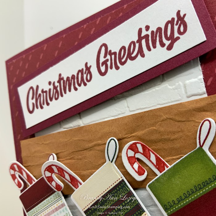 On the stocking piece of DSP, cut out three stockings either by using the coordinating dies or by fussy cutting them out.