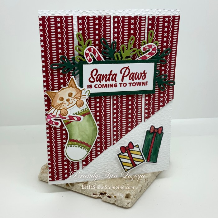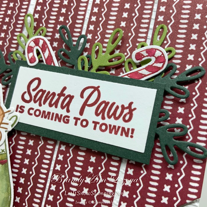 Stamp, color, and die cut candy canes. Candy canes are stamped and colored in Cherry Cobbler ink.