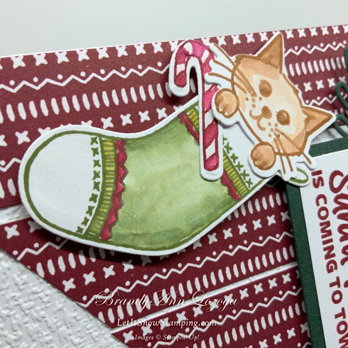 Tape cat stocking to the back of the sentiment as well as the leaves in mixed pairs.