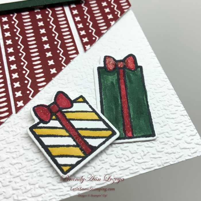 Adhere the large gift with Seal adhesive to the bottom right corner of the card. Adhere the smaller gift using a dimensional.
