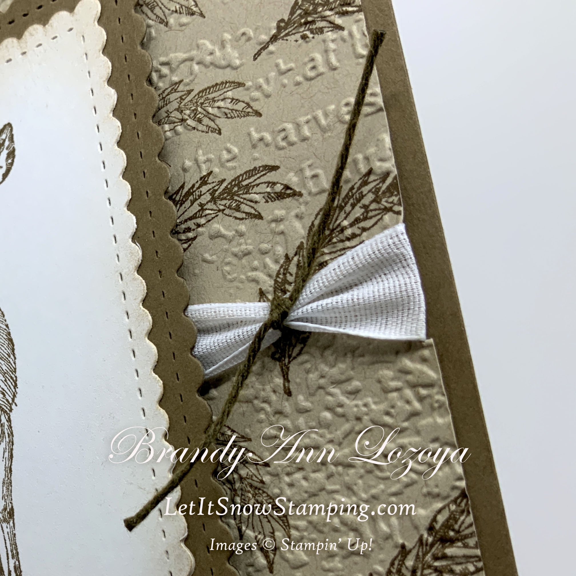On Crumb Cake card front, stamp feather stamp randomly to make your background. Some feathers were stamped twice before re-inking.