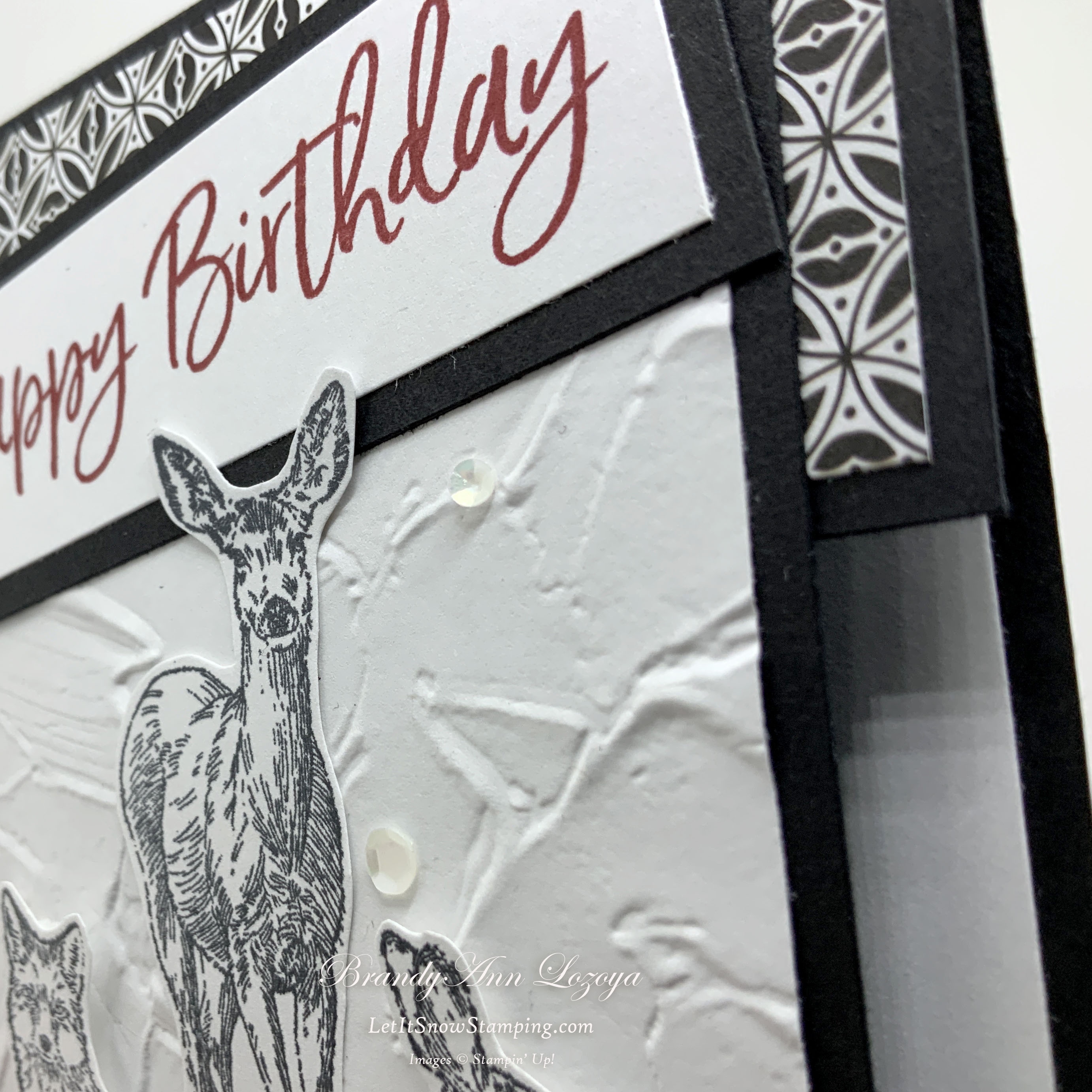 Adhere deer with regular adhesive and then adhere the fox and rabbit using dimensionals. Use every available piece of foam adhesive on your dimensionals sheet!