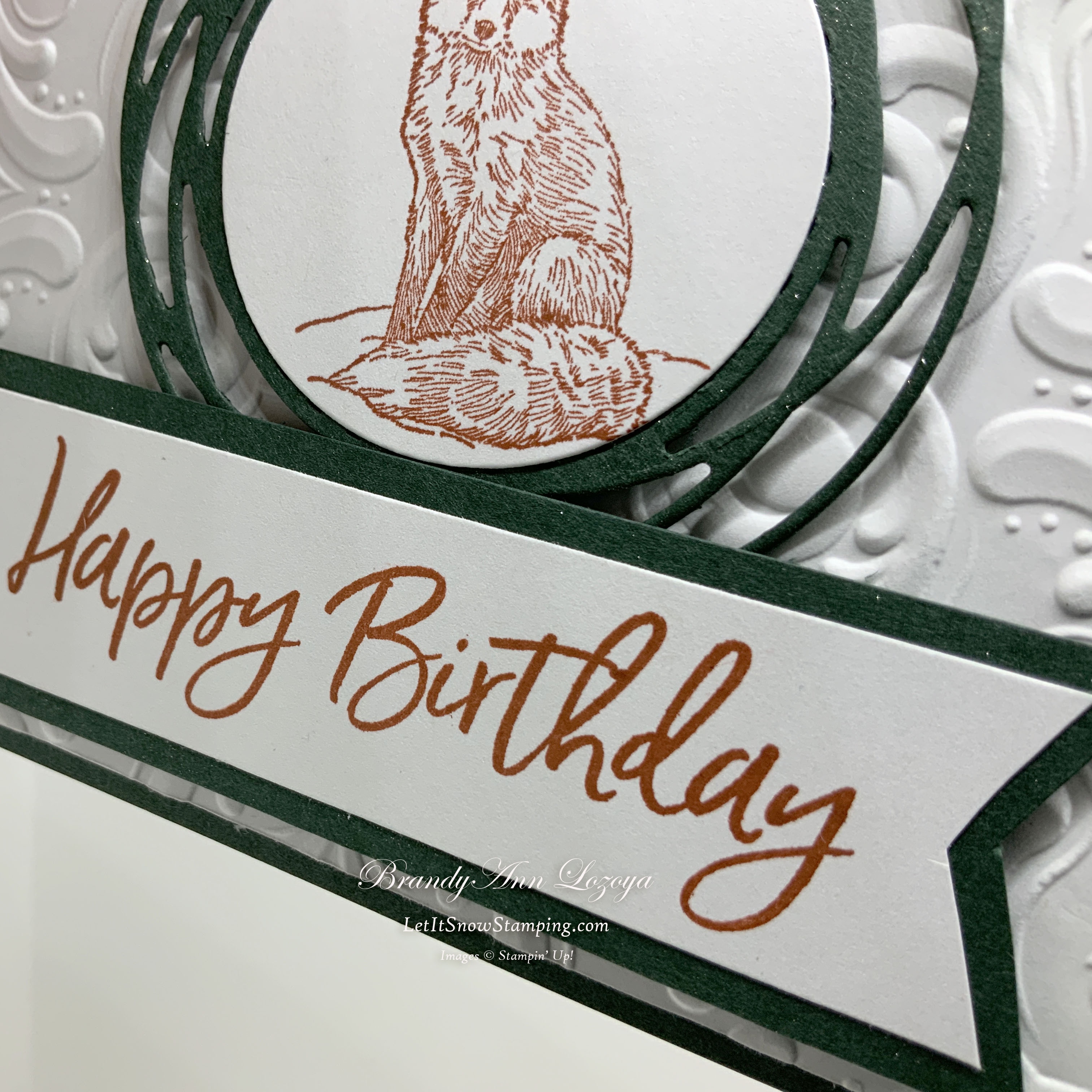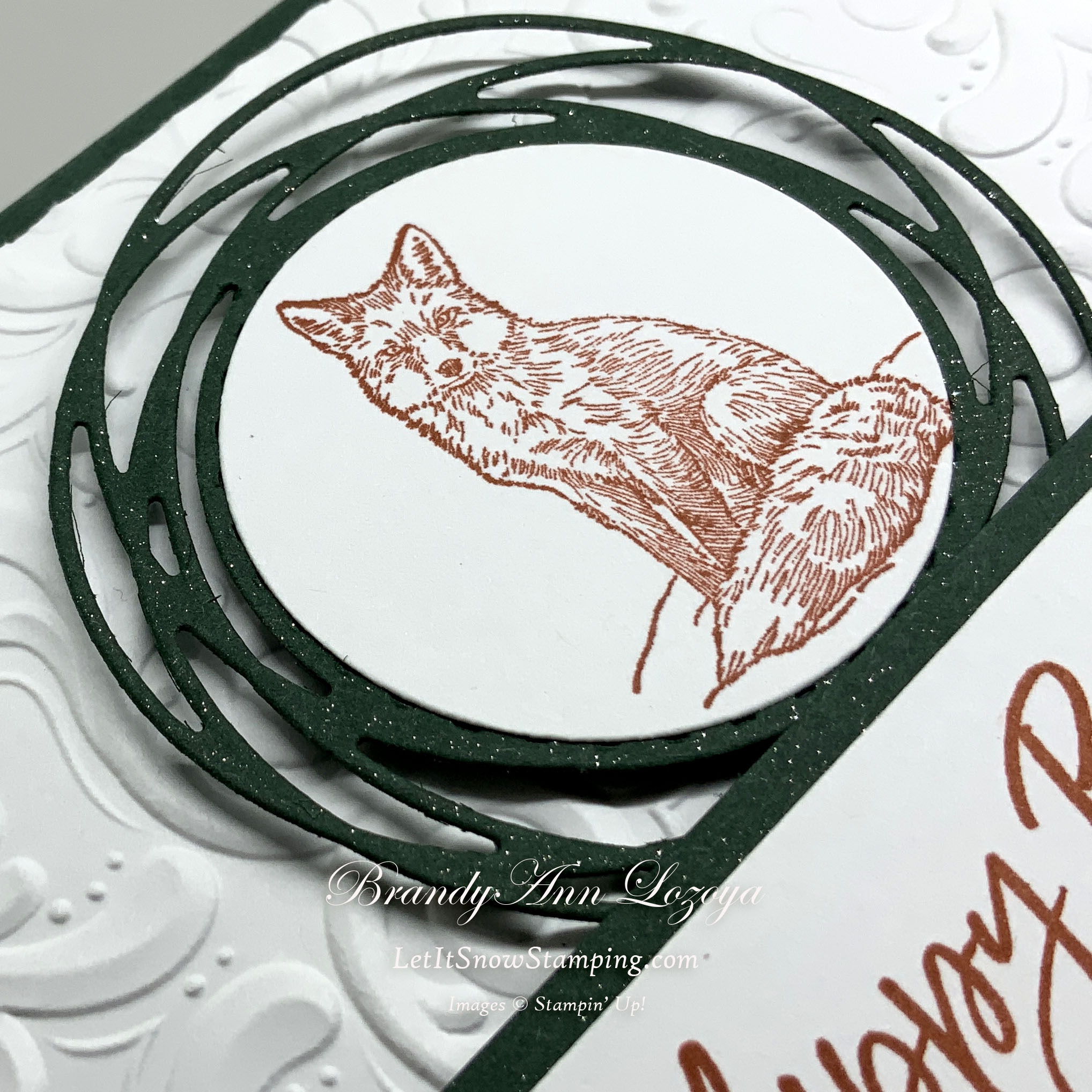 Using the circle in the Painted Labels Dies set, cut one circle in Evening Evergreen. Adhere fox into the center.