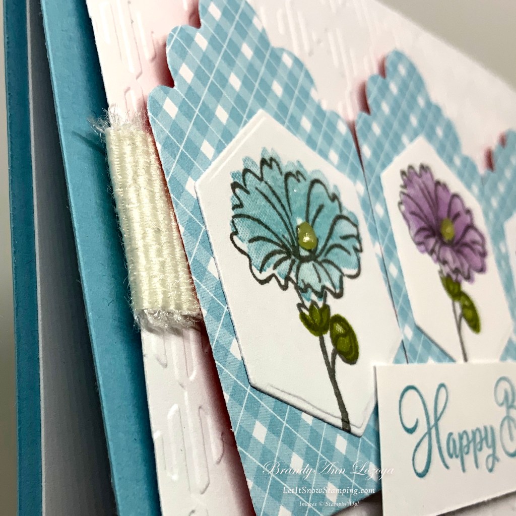 Next, I embossed the Basic White card front with the Gingham EF and wrapped a piece of Frayed Ribbon around the front. I then secured the ribbon to the card front by taping the edges to the backside. Next, I used Dimensionals to adhere it to the Balmy Blue card base.