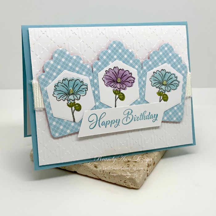 Center one flower on each tag as shown. Add one dimensional on the top and bottom of each tag and adhere to the card front. Try not to place the Dimensionals on the ribbon so it is not so bulky. I placed the two Balmy Blue flowers first then centered the Highland Heather flower in between.
