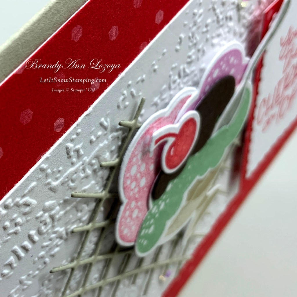I stamped the large scoop using Mint Macaron, small scoops in Fresh Freesia and Sweet Sorbet (the Sweet Sorbet I stamped it twice without reinking and used the lighter one and saved the other for another project).